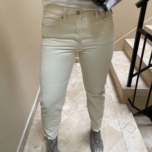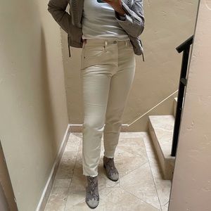 Levi’s Wedgie Jeans in the wash Neutral Ground. i love these but I cant pull off white jeans at all sadly. sz 30 but I’m a 29 and they fit perfectly. i usually size up in Levi’s so know your size! more of a cream than white. raw frayed hem and button fly. never worn, NWOT.