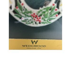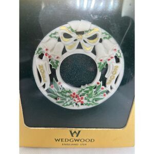 Keywords: Wedgwood, Christmas ornament, fine porcelain, holiday theme, gold, annual wreath, holly and berries, original box, 2003, United States.