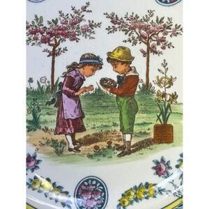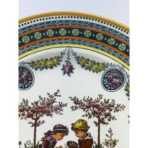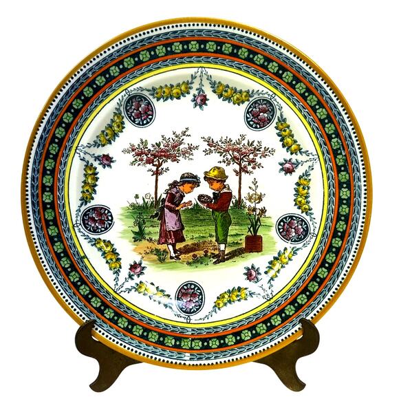 Antique Wedgwood 'Garland' plate-extremely rare! This plate features a beautiful multicolor 'Garland' pattern, showcasing the artistry of Kate Greenaway, a famous Victorian artist that Wedgwood featured on some of their plates. The design is from a Wedgwood tile series, which depicts English children at play, and this is one of the plates from a series of twelve. The plate has both the impressed "Wedgwood" mark as well as a Wedgwood Etruria England and is numbered. It's an antique from about 1850-1899 (1879 based on the 3 letters impressed on back). This plate is in excellent antique condition with no chips, cracks or crazing. A great addition to any Wedgwood collection. # 5453