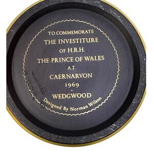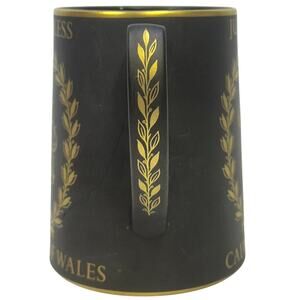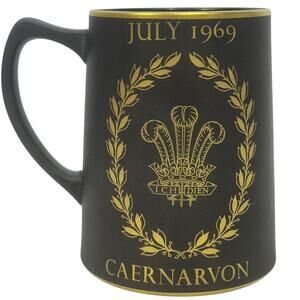 Wedgwood Commemorative Tankard! A beautiful Wedgwood black basalt jasperware with gold accents commemorative tankard/mug designed by Norman Wilson. This tankard measures 4.5/8"H x 3 1/8" in diameter and is in excellent condition. This tankard commemorates the investiture of H.R.H. The Prince of Wales at Caernarvon July 1969. 'God Bless The Prince of Wales' a great collectible piece by Wedgwood-absolutely stunning! # 5447