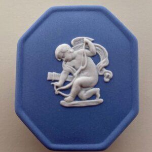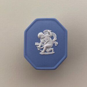 Wedgwood Blue Jasperware Small Octagonal Pill Box with White Motif - Cupid