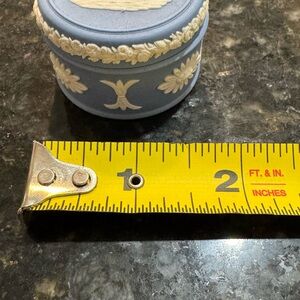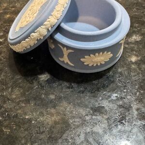Charming Wedgwood round box. Features intricate relief design. Ideal for decor.
