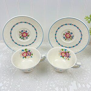 Wedgwood Evenlode Corinthian Floral Set of 2 Tea Cups & Saucers England Embossed