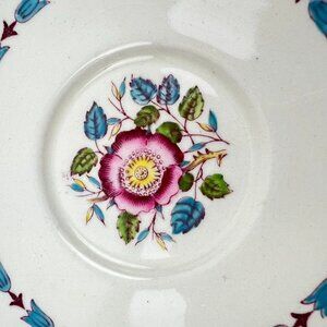 This Vintage Wedgwood Evenlode Corinthian set showcases intricate embossed details, vibrant floral patterns, and a classic design, offering timeless elegance for tea service.