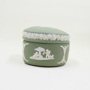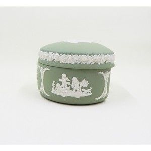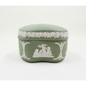 Wedgwood Green Jasperware Cupid As Oracle Bean Shaped Trinket Box with Lid