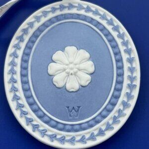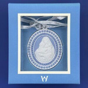 This product is a Wedgwood Jasperware Ornament featuring Madonna and Child design, perfect for collectors of religious-themed ornaments. The ornament comes with its original box and ribbon, making it a complete and collectible piece for any holiday or seasonal display. Made from high-quality Jasperware material, this ornament adds a touch of elegance and tradition to any collection.