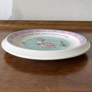 Darling Wedgwood "Jemima Puddle-Duck" child's ceramic plate measuring 6 1/4" inches diameter. It includes a couple of lines from Beatrix Potter's "The Tale of Jemima Puddle-Duck" book. This plate is vintage from 2003. It would be sweet to use or decorate with for Easter.