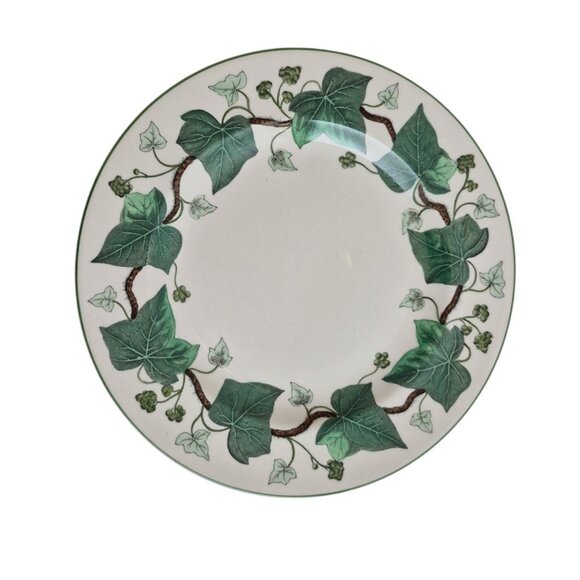 The Wedgwood Napoleon Ivy Dinner Plate features a classic green vine leaf design on a 10-inch Queens Ware plate, crafted in England. Perfect for both casual and formal dining settings. Add a touch of elegance to your table with this timeless piece.