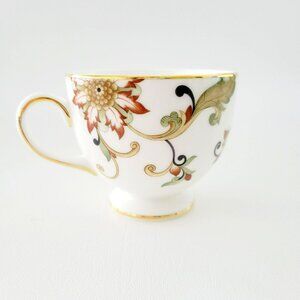 This Wedgwood Oberon Teacup & Saucer set features a Leigh Shaped Footed Cup adorned with a paisley design in rust, green, and black hues. Made from high-quality bone china, it holds up to 6fl. oz.