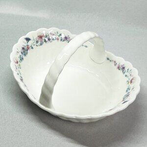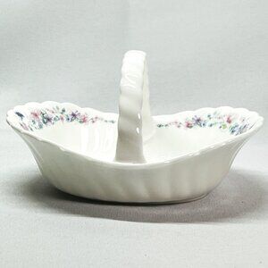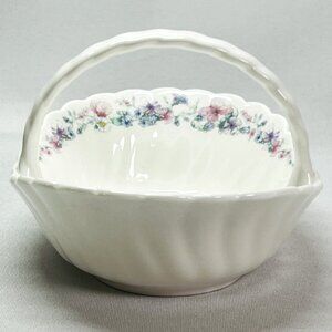 Beautiful Wedgwood fine china basket with delicate pink, purple, and blue flowers in the Angela pattern. Made in England, dated 1980.