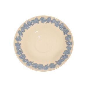 Pattern/Line: Embossed Queens Ware. This is a classic Wedgwood pattern known for its raised, decorative borders. In your set, the border features a floral or vine motif, which appears to be in a light blue or periwinkle color against a cream-colored background.