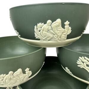 Set of 6 green melamine bowls, ideal as plant pots or versatile household containers. Features a Wedgwood-inspired design. Each bowl measures approximately 5 inches in diameter and 3 inches in height. Durable and lightweight, perfect for indoor or outdoor use. Manufactured in the 1950s-1960s. Classic mid-century style.