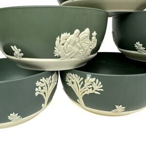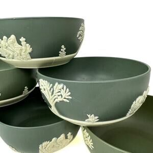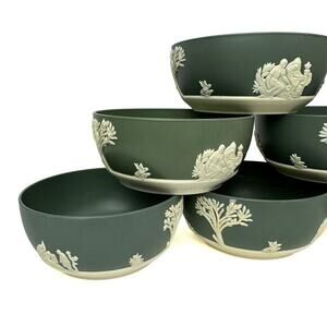 Set of 6 green melamine bowls, ideal as plant pots or versatile household containers. Features a Wedgwood-inspired design. Each bowl measures approximately 5 inches in diameter and 3 inches in height. Durable and lightweight, perfect for indoor or outdoor use. Manufactured in the 1950s-1960s. Classic mid-century style.
