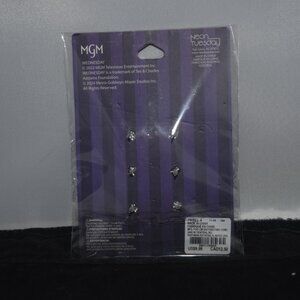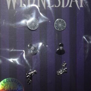 This Wednesday Addams Earring Set is a three-pair stud collection featuring iconic motifs from the Netflix series Wednesday. The set includes silver-tone designs of spider webs, Wednesday Addams' silhouette, and the disembodied hand character, Thing.