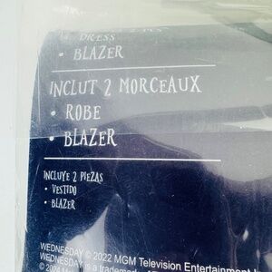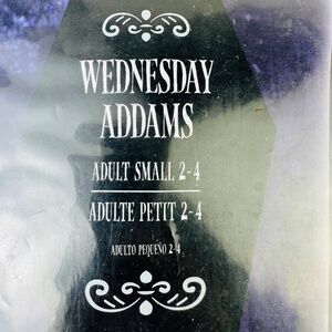 This Wednesday Addams school costume dress & blazer in adult size small (2-4) by Amscan is a complete outfit perfect for cosplay occasions and halloween. The outfit includes a black dress and blazer, is made of polyester material, and is designed with a Halloween theme in mind. The set is ideal for those looking to dress up as the iconic Wednesday Addams character.