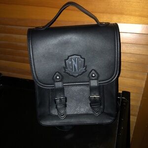Chic black baby backpack. Faux leather with a sleek design. Perfect for everyday use. From Wednesday