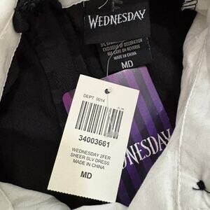 This faux twofer dress is as dark as Wednesday's soul! Made from a black velvet and featuring sheer, striped mesh long-sleeves. Designed with a contrast white bib and peter pan collar with a double chain collar pin with "WA" and raven designs. Complete with side seam pockets and a back zipper closure.