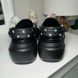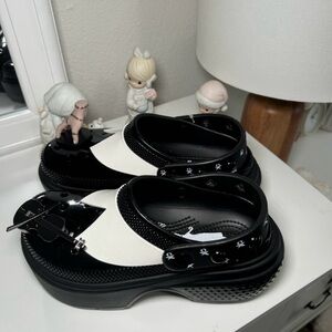 Step up your style with these unique black and white platform crocs. Perfect for making a bold statement.