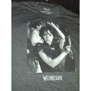 The product is a Wednesday Jenna Ortega Netflix 2023 Charcoal Gray T-Shirt in Men's 2XL size. This shirt features a solid gray color with a crew neck and short sleeves, made of a blend of polyester and cotton. It is machine washable and suitable for all seasons, making it a versatile and breathable option for men. The shirt is designed with a regular fit and is themed around a movie, perfect for fans of the show or movie. Made in Pakistan, this T-shirt is a stylish and comfortable choice for everyday wear.