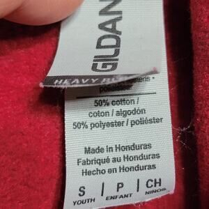 Wednesday LS Burgundy Youth Hoodie (Gildan) - Size Y Small. There are light spots in the front pockets (see picture 5) and spots on each sleeve cuff (see the last picture). Comes from a smoke free home.