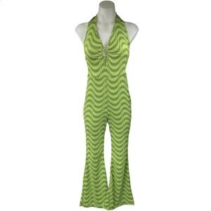 Wednesday's Girl Green Halter Retro Sleeveless Striped Flare Jumpsuit Size S
