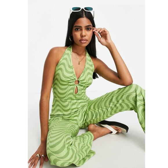 Wednesday's Girl Green Halter Retro Sleeveless Striped Flare Jumpsuit Size S