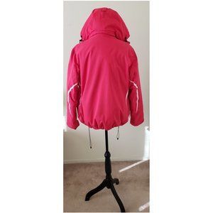 Warm and cozy pink ski jacket with detachable hood, loads of pockets. Waterproof and bright so that everyone will be able to see and find you on the slopes or in the forest cross-country skiing to your heart's content.