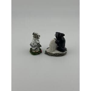 The Wee Forest Folk Ghost of Christmas Future and Marley's Ghost Mice Figurines from 1987 are handmade clay figurines of mice. These unique collectibles are crafted in the United States and are sure to be a charming addition to any animal or Christmas decor collection. Each figurine captures the essence of the spooky Christmas season with its intricate details and whimsical design, making them a must-have for collectors of small pet and animal figurines. They were both created by Annette Petersen. The ghost is #CC-6 and Marley is CC-3. They are part of the Christmas Carol Collection. The Ghost mouse has had his hand repaired. The Marley mouse is in excellent condition with no damage. The price is for both. They measure 1.5" tall and 1" long.