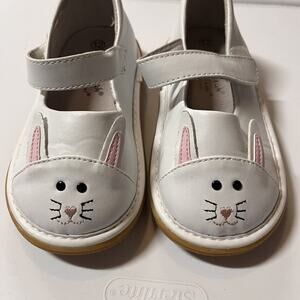 Super cute bunny shoes! Appear to run wide. These do have a squeaker in them so when you walk they make noise. This can be plugged or removed also. Hook and loop closure.