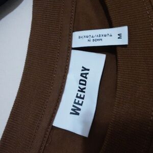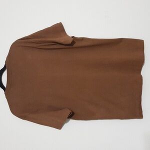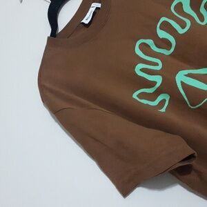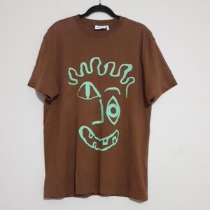 Week End Brown T-Shirt with Green Abstract Face Design Women M casual Y2k Retro
