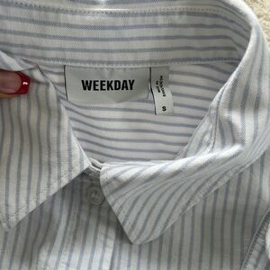 100% Cotton button down by Weekday. Only worn a couple of times and in great condition. No stains or signs of wear. Boxy fit that hits at the hips - very nice quality! Size SM