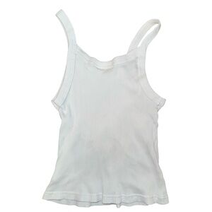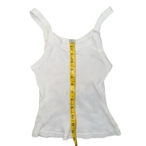Fitted ribbed crop tank with narrow straps. Square neckline for a clean look. Soft stretch knit fabric. Versatile layering piece.