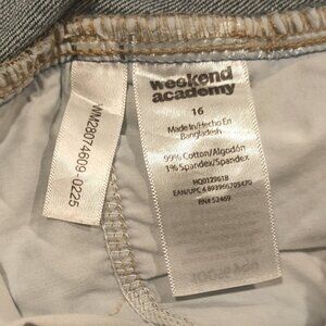 This is a pair of dark wash blue jeans with cuffed hems from the brand Weekend Academy. They are a boy's size 16. The measurements are 31 inches for the waist, 41 inches for the hips, 10 inches for the front seam, and 26.5 inches for the inseam. The waist does have adjustable elastic to make it smaller. It is 99% cotton and 1% spandex, and it is machine washable and dryable. They are new with tags.