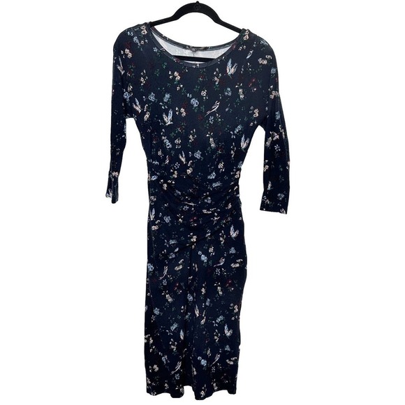 Weekend Max Mara Midi Bird Dress Floral Ruched Long Sleeve Round Neck Navy Small