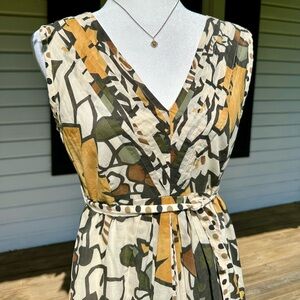 This is a preloved dress by Weekend Max Mara in a flora and polka dot print with a tie for the waist. It has a v-neck with pleating around the top and middle of the dress.