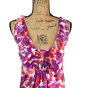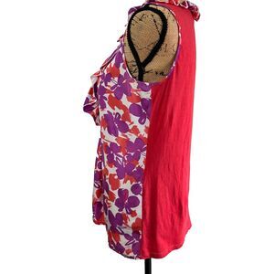 This Weekend MaxMara Women's Red Floral Ruffle Neck Cotton/Silk Tank Top features deep scoop neck with ruched detail and a ruffled trim around the neckline. It has a striking floral pattern in shades of red and purple, with a solid red cotton jersey panel on the back and floral silk panel on the front.