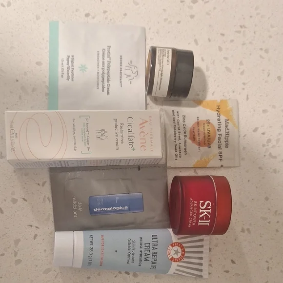 Drunk Elephant Protini polypeptide cream, Perricone MD retinol recovery overnight moisturizer, MadHippie hydrating facial spf 25 + UVA/UVB, SK-II skin power advanced cream, Dermalogica daily milkfoliant, Avene Cicalfate+, and First Aid Beauty Ultra Repair Cream.