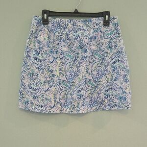 These vibrant skorts are perfect for a casual day out. The mini length and lightweight fabric ensure comfort and style, while the green and blue hues add a refreshing touch. There is a small touch of pink as well in the design. Ideal for resort wear, these skorts offer a chic and relaxed look.