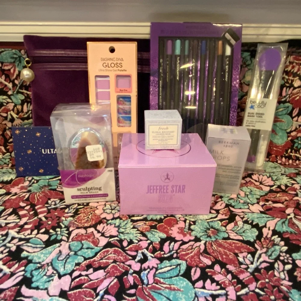 Here is a set of different products that gives you everything you need for a relaxing day, or night. There’s also enough of a variety of products that there’s something in there for everyone if you’re with a group 🙂. It starts with Jeffree Star’s Tranquility Face Mask and then moves on to Beekman 1802’s moisturizing Milk Drops. Fresh Floral Recovery Calming Mask is another good option to use. Use the 2 new brushes, or the 9 new L.A. Girl Eyeliners. It’ll pair well with the Ulta Eyeshadow Palette. Dashing Diva nail gloss strips match the whole package, including the makeup bag! All are NWT except the Ulta Palette is out of its original pack, it is new though, and never has been used.