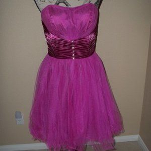 Raspberry, satin and tulle combination, sweetheart shape neckline with padded bust built in, satin waistband adorn with rhinestones, zipper back, A-Line tulle skirt with curled hemline, lined, stylish short formal dress, perfect for prom or any special occasion.