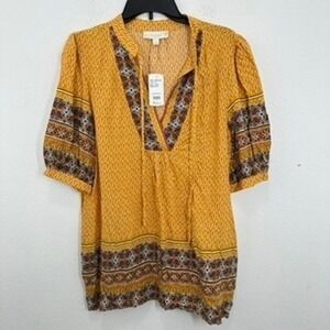 Keywords: tunic top, Suzanne Betro, Weekend, gold, paisley, elbow sleeve, flounce sleeve, notch neck, casual top, bohemian, boho, new with tags, tassel tie, banded hem