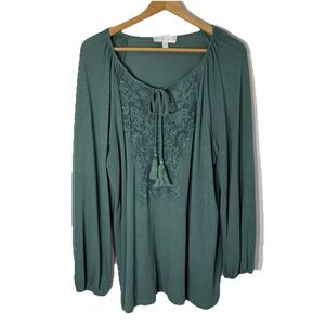 Weekend Suzanne Betro Women's Crocheted Boho Top Long Sleeve Green V-Neck 1X