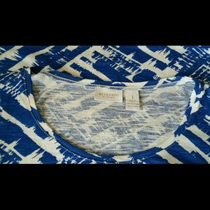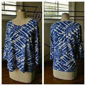 Weekend by Chicos Royal Blue & White Print Top. Comfortable, lightweight jersey. Great condition only worn a couple of times. Great casual summer find. Measurements are: Length is 24", Sleeve Length is 18", bust width is 21"and waist width is 21" and can stretch to 23". Size chart attached for reference.