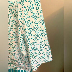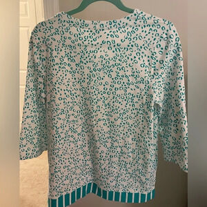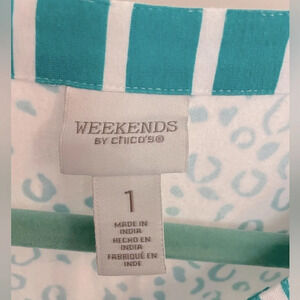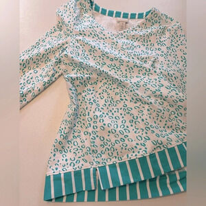 EUC Weekend by Chico’s Leopard ways striped trim top with wide striped hem. Size 1, also has hip peeks and 3/4 sleeves and v-neck. Cotton and spandex blend for comfort. Beautiful, turquoise, and white with a nautical twist. L:25/ Pit:18/ Sleeves:17. easy care garment. 9.6oz