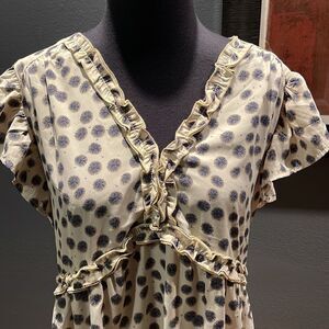 Weekend by Suzanne Bistro double narrow ruffle accent and wide ruffle sleeve top. Wide hem ruffle. Adorable print-see pics for details. Pullover. No wrinkle 100% polyester. Medium. Like new. Nonsmoking home.