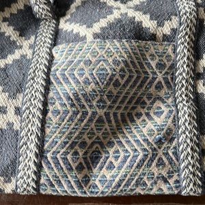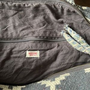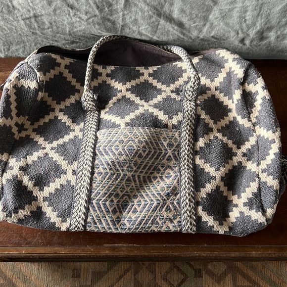 Beautiful woven fabric. Short/long straps. Like new, zippers work great. Flat bottom. Inside pockets