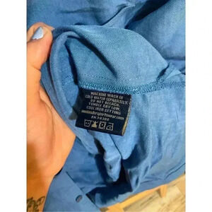 Lightweight casual button down shirt with pal tree and flamingo patch work spots on it.