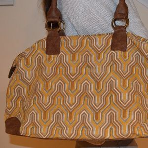 Perfect weekender/travel bag with vegan leather handles - NEW, never used. It has a beautiful block stamped pattern and a zipper closure. Fully lined and has 3 pockets with one having a zipper. Dimensions: 23 x 15 inches, handles are 19 inches. JOYN is a ministry in India that works with men, women, and street kids. They also teach them a trade and give them employment. Know that when you purchase a JOYN product that you are investing in the lives of many people in Northern India.