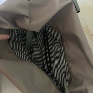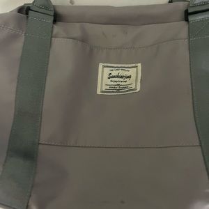 Has pocket on outside as well as sleeve for topping it on roller bag