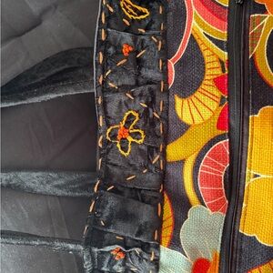 This floral duo is fantastic for a quick weekend trip beautiful colors a heavy woven fabric lined in black satin lots of pockets inside and out. Has a black velvet trim on the tote bag with hand embroidery has great details